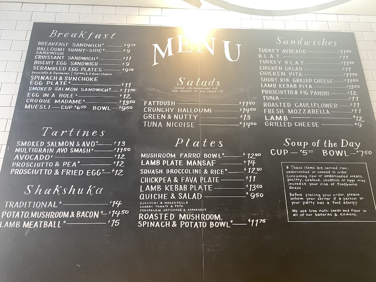 Two fried eggs nestled in a housemade sesame Jerusalem bagel, served with chopped salad. (690 cal, Contains: Wheat, Milk, Egg, Sesame)